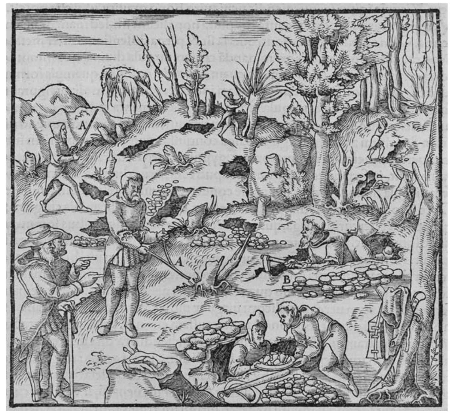 Woodcut from Georgius Agricola, De Re Metallica. Basel, 1556. Page 40. Translated by Herbert Clark Hoover and Lou Henry Hoover. Salisbury House, London. 1912.